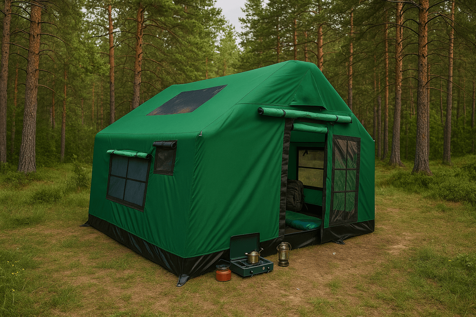 Family ECO 10 is our inflatable tent model designed for large families and groups of friends, offering economical camping solutions with its 10-person capacity. It stands out with its spacious interior, easy setup, and four-season usability.