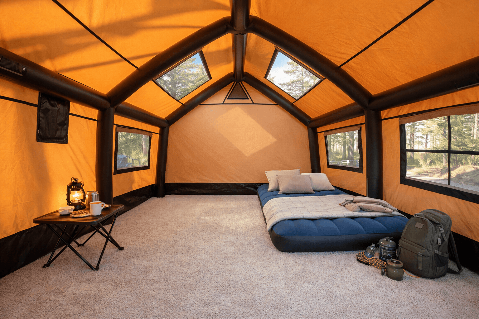 Thanks to its 100% waterproof fabric, strong inflatable frame, and chimney outlet, it can be used safely in any weather conditions. Its panoramic windows provide an airy interior, and with its practical design that can be set up in just 5 minutes, no technical knowledge is required.