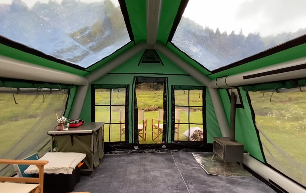 Fireproof Stove Mat (EXTRA OPTION): A fireproof mat designed to allow you to safely use a stove inside the tent, isolating the heat from the stove and protecting the ground. This adds extra safety and comfort during cold weather.