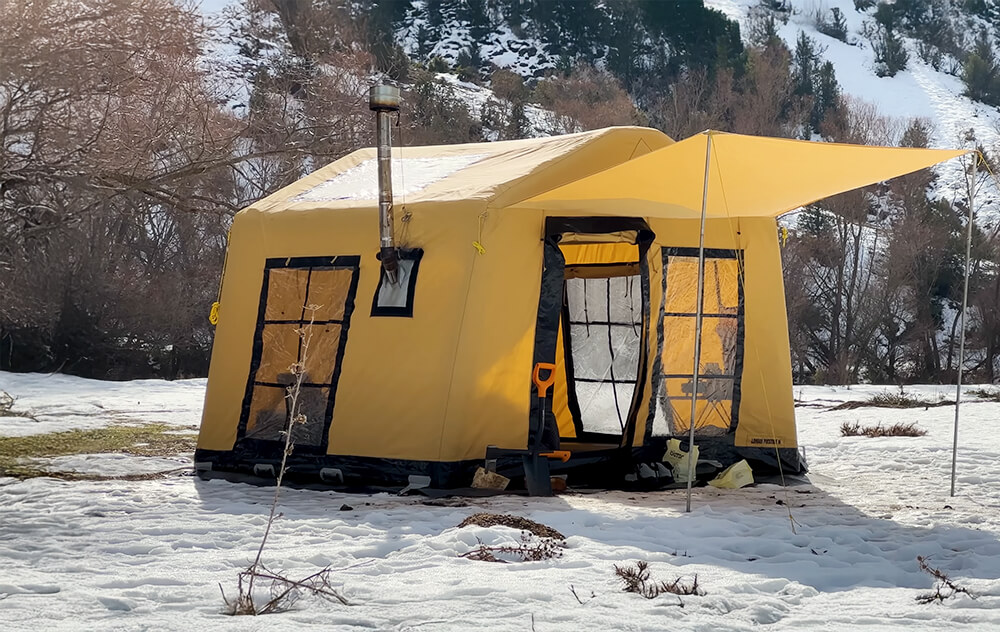 Fireproof Stove Mat (EXTRA OPTION): A fireproof mat designed to allow you to safely use a stove inside the tent, isolating the heat from the stove and protecting the ground. This adds extra safety and comfort during cold weather.