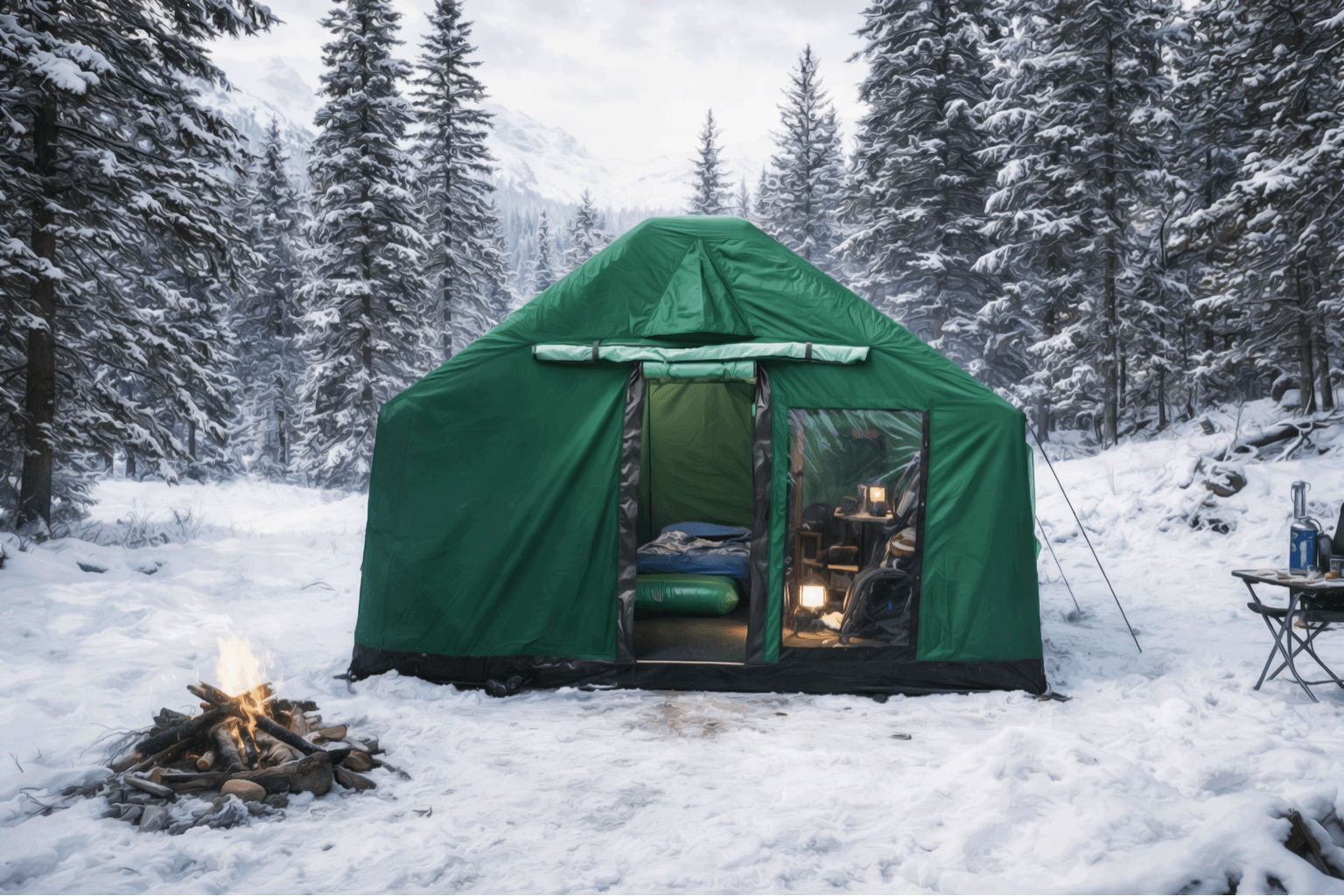 100% waterproof fabric, strong inflatable frame and stove jack make it safe to use in all weather conditions. While its panoramic windows provide a spacious interior environment, being able to be set up in only 5 minutes offers practical use — it does not require any technical knowledge.